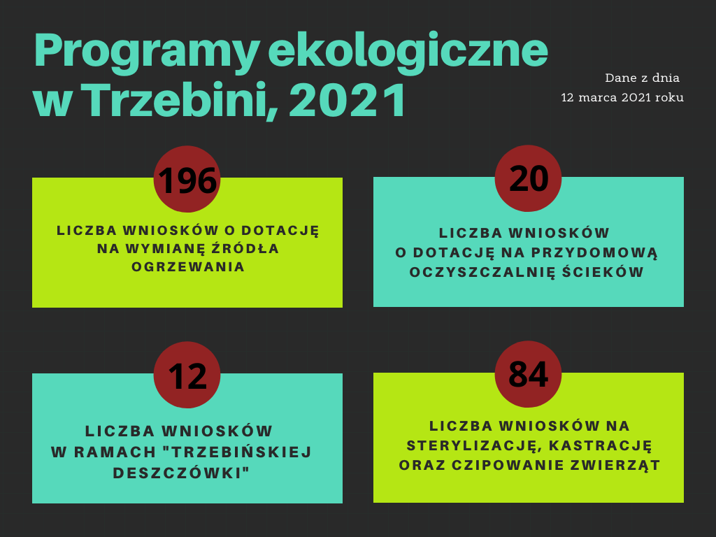 Dużym zainteresowaniem cieszy się program ograniczenia niskiej emisji, w ramach którego mieszkańcy mogą ubiegać się o dotację do wymiany emisyjnego źródła ciepła. Do połowy marca 2021 roku do urzędu miasta wpłynęło 196 wniosków.