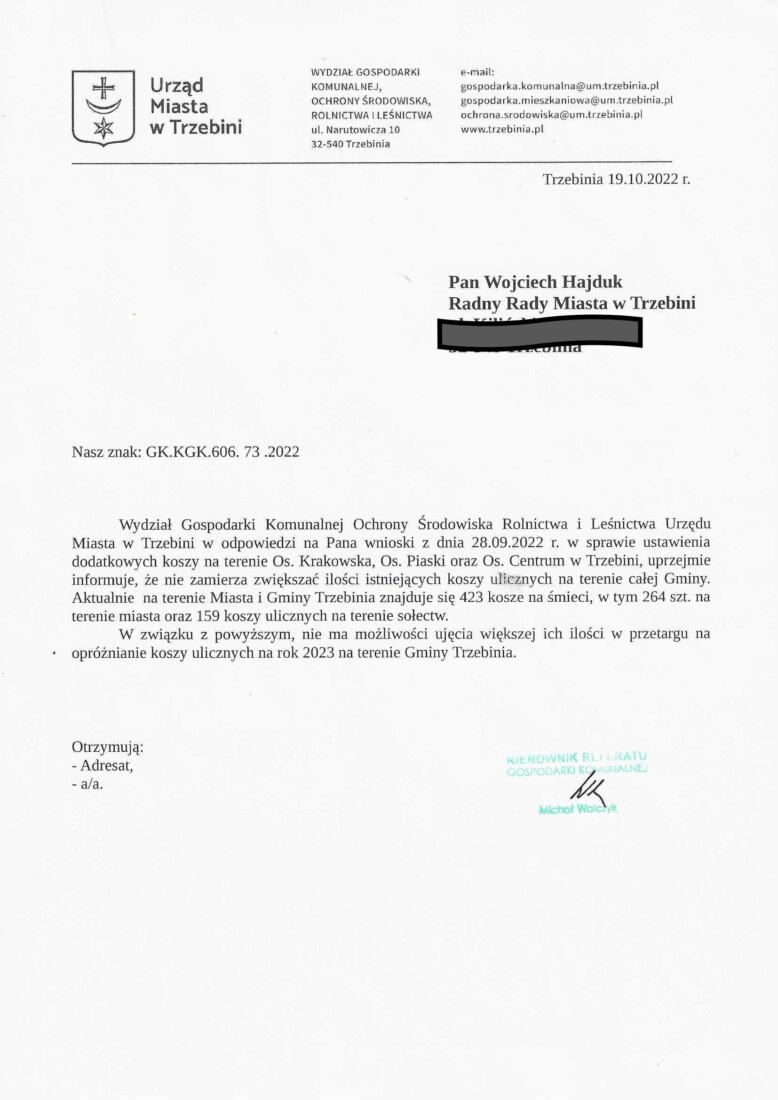Coraz częściej słyszę o potrzebie zwiększenia koszy na śmieci, zarówno w mieście, jak i w sołectwach trzebińskich. Z wnioskiem o ujęcie tego w nowym przetargu wystąpiłem do urzędu we wrześniu.