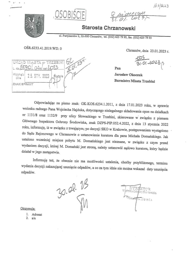 Przekazuję odpowiedź Starosty Chrzanowskiego na moje zapytanie dotyczące sytuacji związanej ze składowiskiem opon przy ulicy Słowackiego w Trzebini.