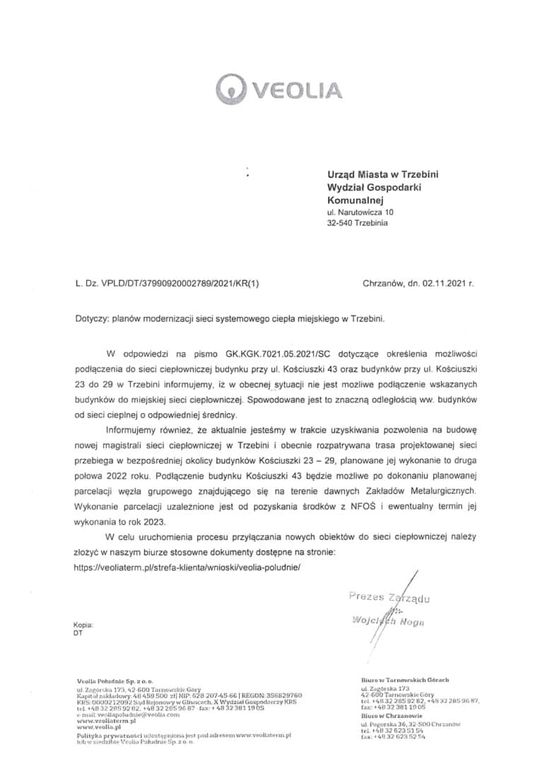 W imieniu mieszkańców zabudowy wielorodzinnej przy ul. Kościuszki w Trzebini, wystąpiłem do VEOLIA POŁUDNIE o określenie możliwości przyłączenia budynków do ogrzewania systemowego.