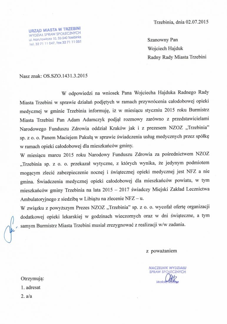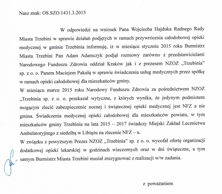 Za nocną opiekę odpowiada NFZ, który rozpisuje kontrakty, niestety gmina nie może finansować tego typu zadań. Wiem, że były rozmowy zarówno w Funduszu, jak i Miejskim Centrum Medycznym z Libiąża, które obecnie świadczy usługi na terenie powiatu, ale nie ma zgody NFZ na chociaż częściowo-nocną opiekę zdrowotną, np. do 24:00, kiedy to jest największe „zainteresowanie” (tak wynikało ze statystyk, które wykonał burmistrz Okoczuk, a dane pochodziły z czasu, kiedy nocna opieka zdrowotna funkcjonowało w Przychodni na os. ZWM 23).