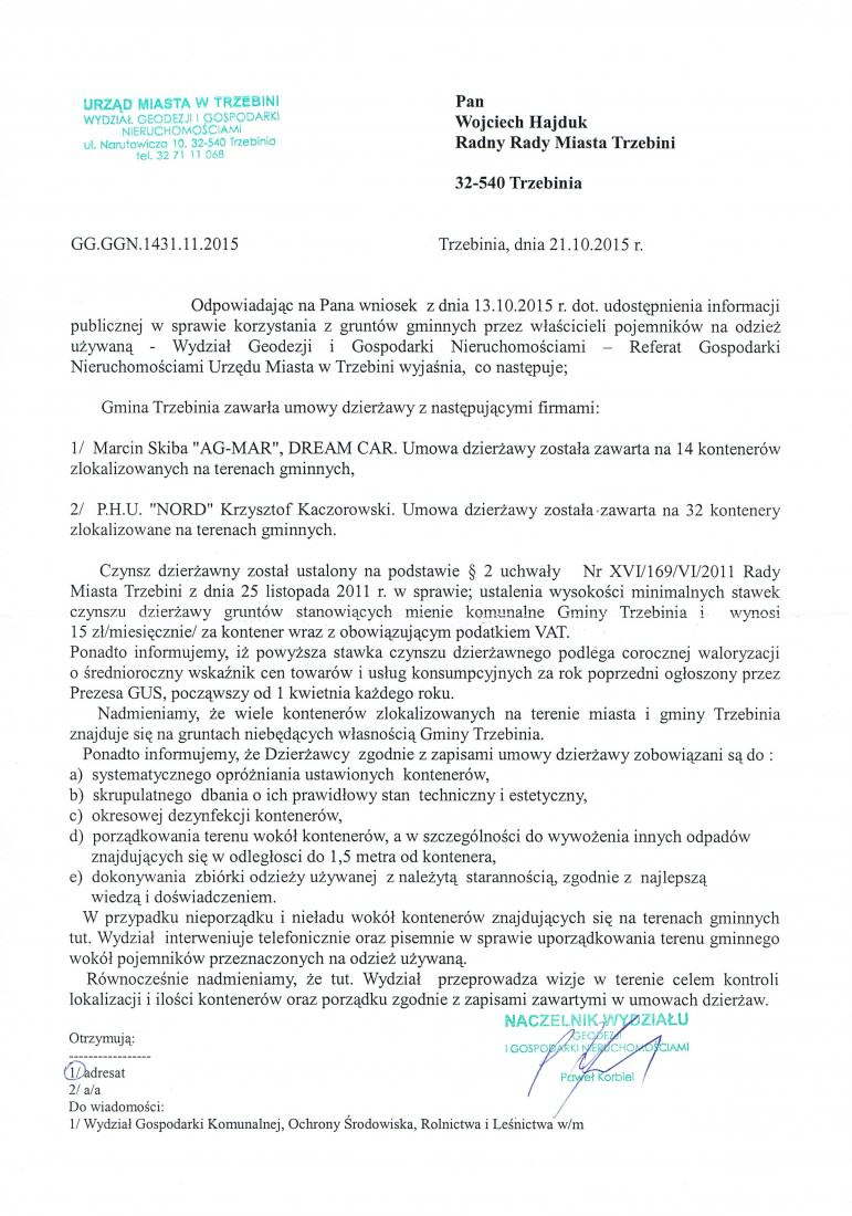 W odpowiedzi na moje zapytanie dotyczące zajmowania terenów pod pojemniki na odzież używaną w mieście otrzymałem pisemną odpowiedź z Urzędu Miasta.
