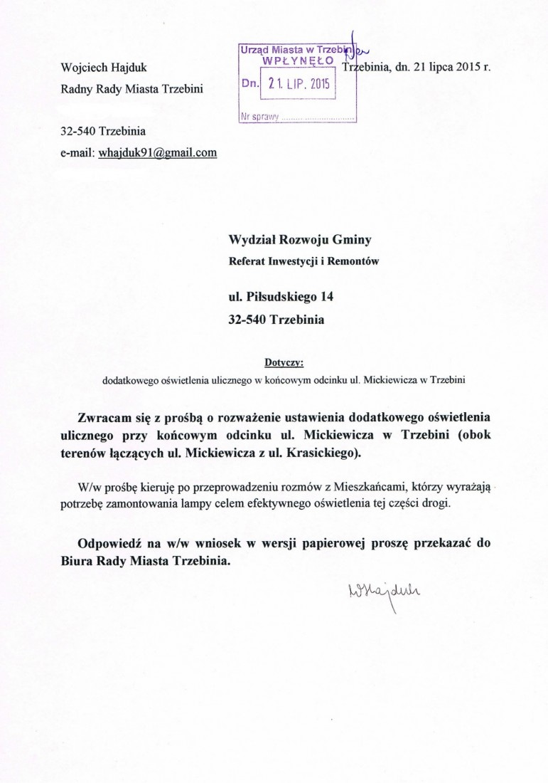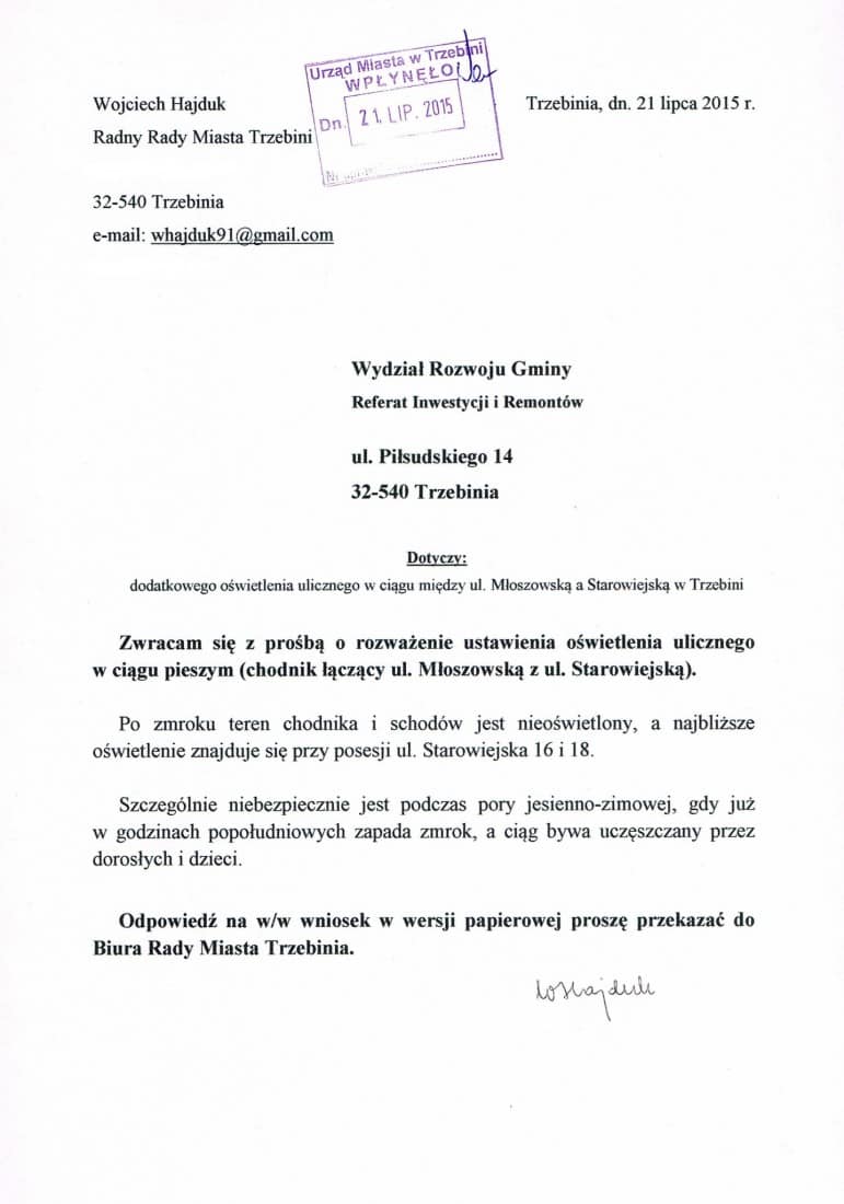 [symple_box color=”green” fade_in=”false” float=”center” text_align=”left” width=””]Zwróciłem się również z prośbą o rozważenie ustawienia oświetlenia ulicznego w rejonie ul. Mickiewicza oraz w rejonie ul. Starowiejskiej i Młoszowskiej.[/symple_box]