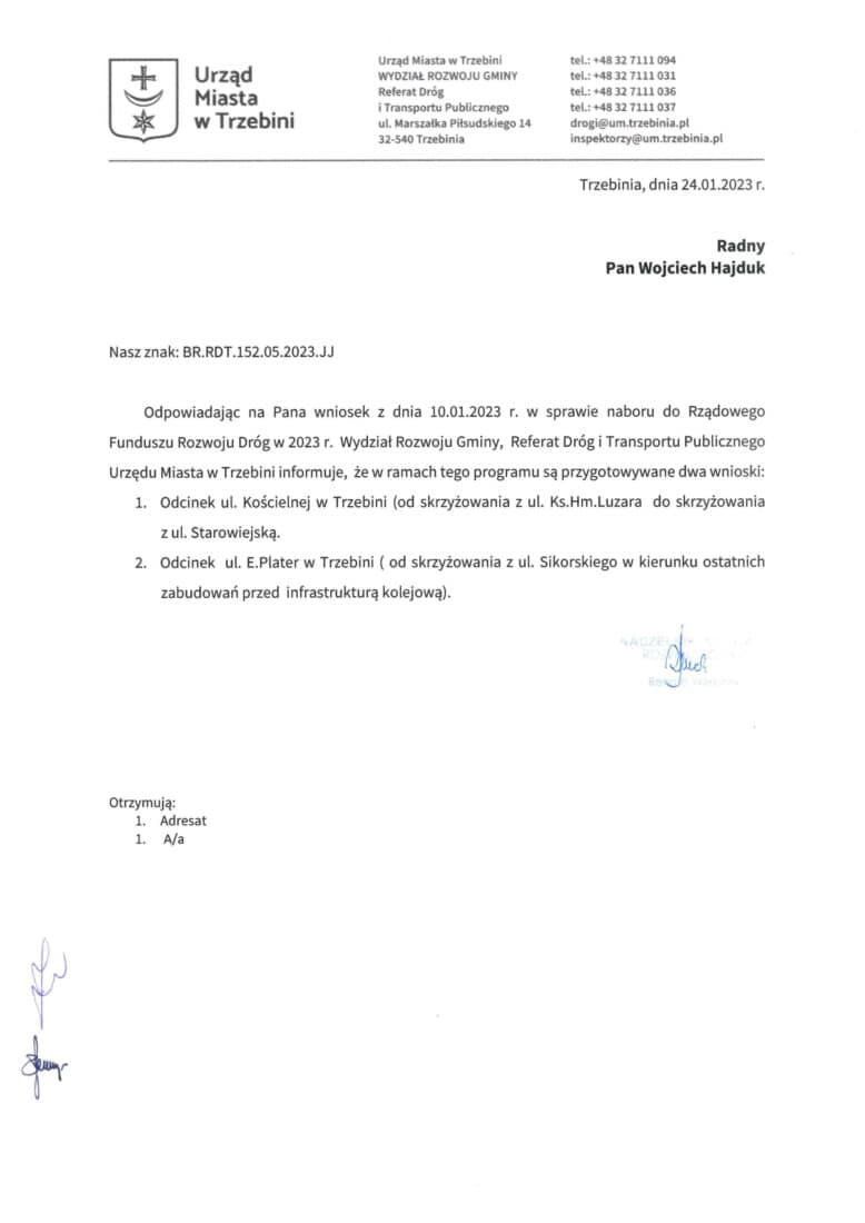 Gmina Trzebinia, odpowiadając na mój wniosek dotyczący uwzględnienia kilku ulic z terenu centrum Trzebini, odpowiedziała, że w naborze do Rządowego Funduszu Rozwoju Dróg planuje zabiegać o dofinansowanie remontu ulicy Kościelnej w Trzebini – fragmentu od ul. Luzara do skrzyżowania z ul. Starowiejską.