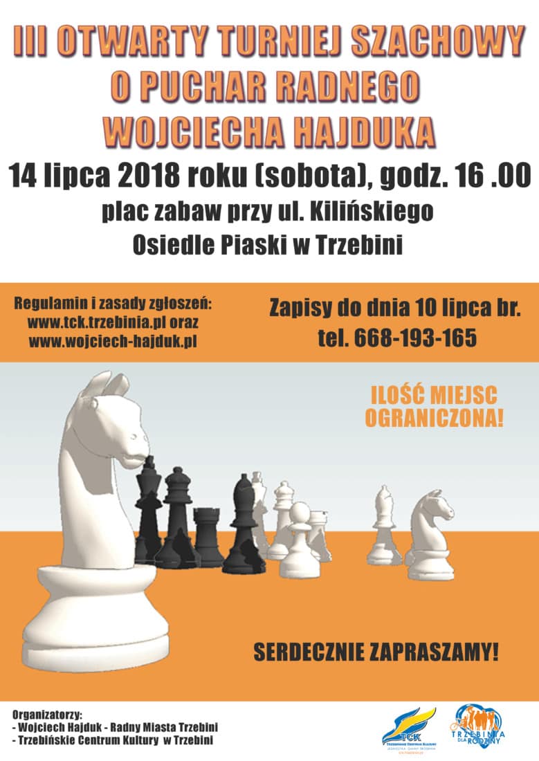 W sobotę 14 lipca 2018 roku na boisku na placu zabaw przy ulicy Kilińskiego (Osiedle Piaski w Trzebini) odbędzie się III Otwarty Turniej Szachowy o Puchar Radnego Wojciecha Hajduka. Rozgrywki rozpoczną się o godz. 16, a zapisywać się można do 10 lipca.