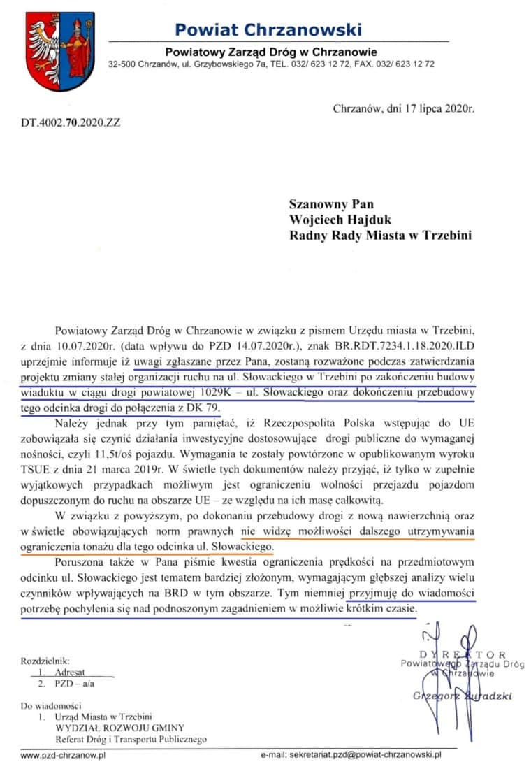 Zarządca drogi, czyli Powiatowy Zarząd Dróg w Chrzanowie, w odpowiedzi skierowanej na mój wniosek dotyczący podtrzymania obowiązujących ograniczeń prędkości (do 40 km/h) i tonażu (do 12 t), poinformował, że 🔶 po oddaniu do użytku nowo budowanego wiaduktu nie jest możliwe podtrzymanie ograniczeń 🔶 m.in. w tonażu.