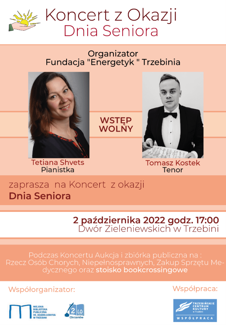 W niedzielę 2 października o godz. 17 odbędzie się Koncert z okazji Dnia Seniora przygotowany przez Fundację „Energetyk”. Współorganizatorami są Miejska Biblioteka Publiczna w Trzebini oraz LO im. K.K. Baczyńskiego w Chrzanowie oraz Trzebińskie Centrum Kultury.