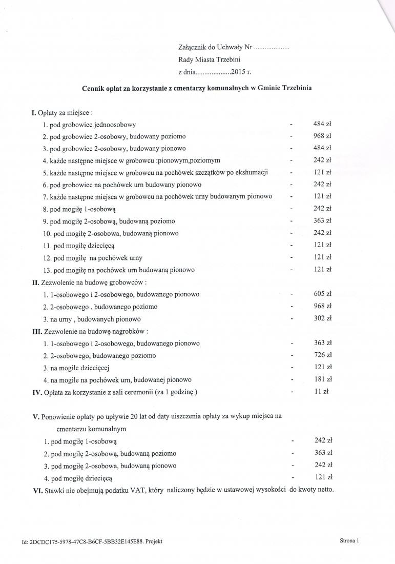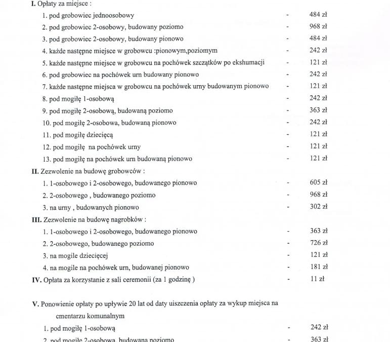 Zgodnie z propozycją stawek opłat cmentarnych od 1 stycznia 2016 r. nastąpi wzrost o 10% w stosunku do obowiązujących aktualnie stawek. Zmiany podyktowane są czynnikiem ekonomicznym, ponieważ aktualnie kwoty pobierane od osób wykupujących miejsce na cmentarzu komunalnym nie pokrywają kosztów, jakie Gmina ponosi przy zarządzaniu cmentarzami.