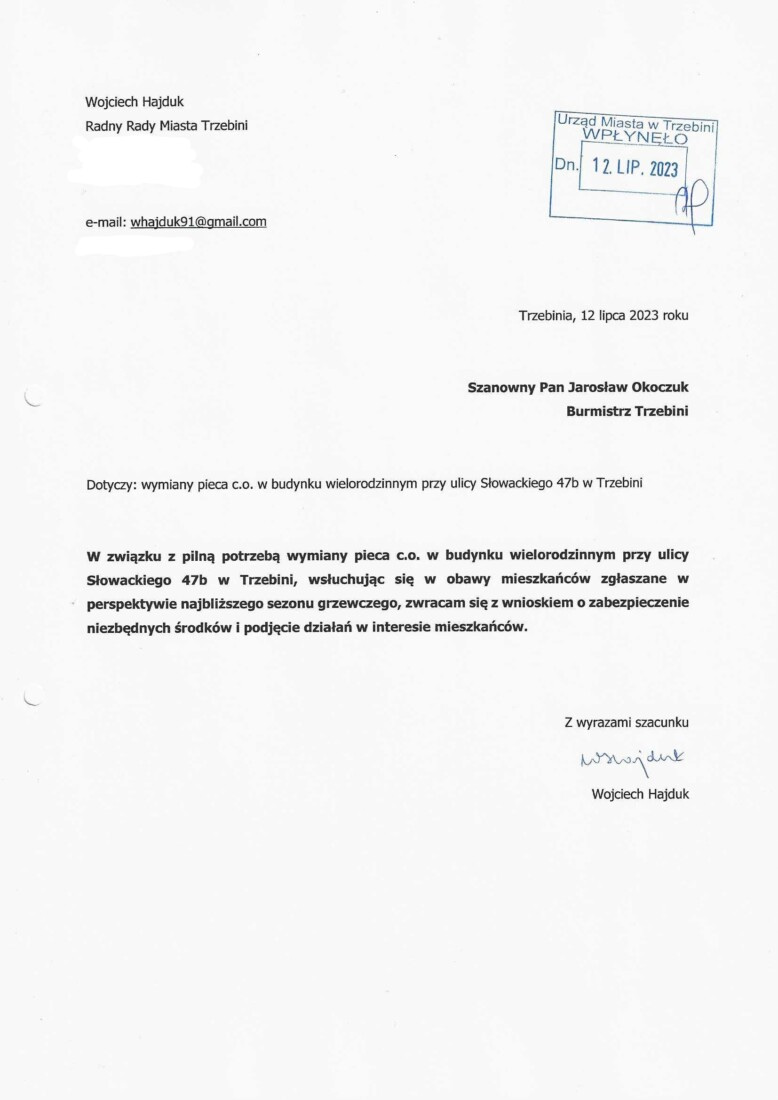 Wniosek w imieniu mieszkańców złożyłem również w urzędzie w I połowie lipca br.