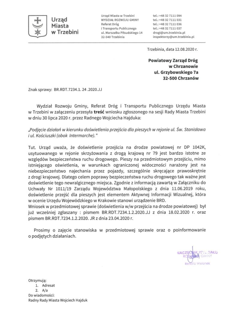 Końcem lipca br. raz jeszcze ponowiłem wniosek o podjęcie działań zmierzających do lepszego oświetlenia przejścia dla pieszych w rejonie ul. Św. Stanisława i ul. Kościuszki (obok sklepu Intermarche). Z przejścia korzysta wielu mieszkańców, a obecne oświetlenie nie spełnia całkowicie swego zadania.