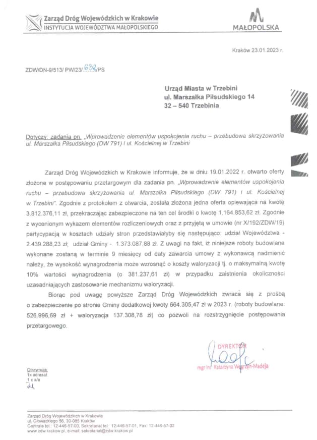 Zarząd Dróg Wojewódzkich w Krakowie przekazał trzebińskim samorządowcom informację z otwarcia ofert dotyczącą zadania pn. „Przebudowa skrzyżowania ul. Kościelnej i Piłsudskiego w Trzebini”. Na zwiększenie finansowego udziału Gminy nie zgodziła się Komisja Budżetu i Finansów. Chodzi o zwiększenie nawet o 700 tysięcy złotych.