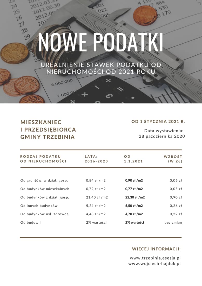Podczas październikowej Sesji Rady Miasta będziemy procedować projekt uchwały dotyczący określenia wysokości podatku od nieruchomości, który obowiązywać będzie od 1 stycznia 2021 roku.