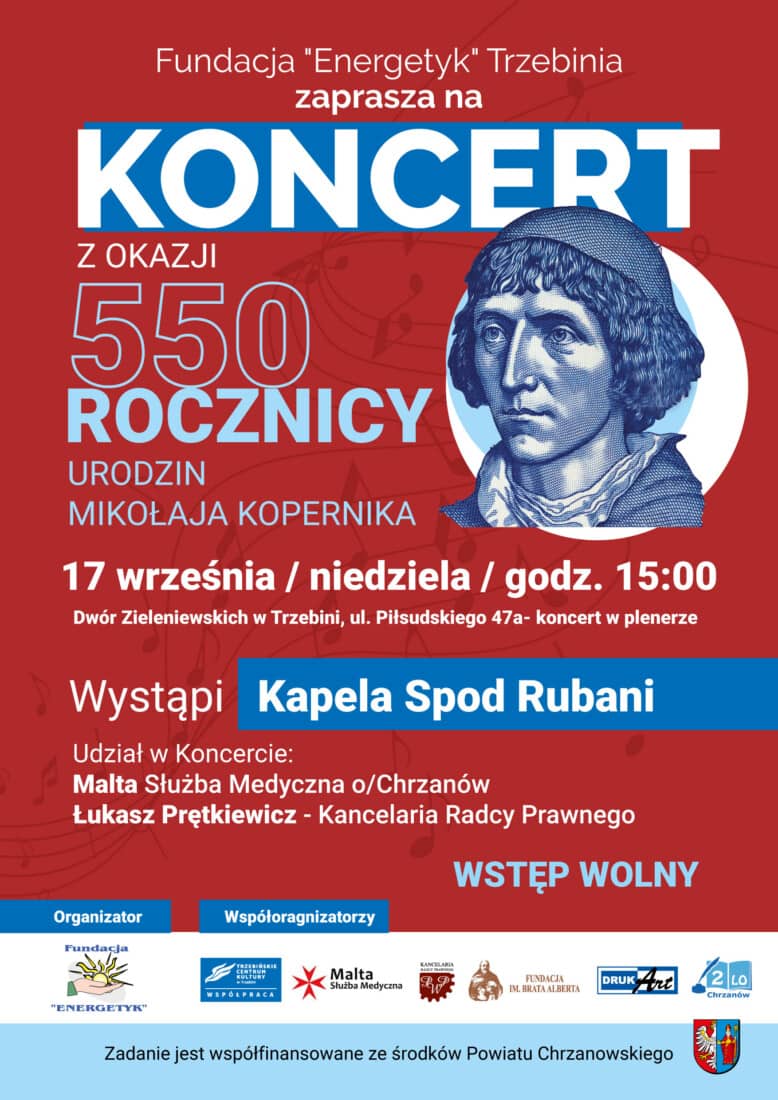 Fundacja Energetyk w Trzebini zaprasza na koncert z okazji rocznicy urodzin Mikołaja Kopernika, który odbędzie się w niedzielę 17 września br. w Dworze Zieleniewskich.