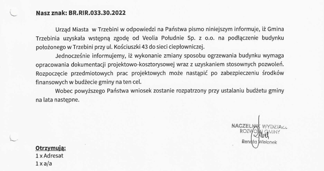 Znamy już odpowiedź na wniosek mieszkańców ul. Kościuszki 43 w Trzebini dotyczący podłączenia budynku do miejskiej sieci ogrzewania.