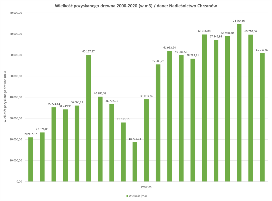 🌳 Wielkość pozyskanego drewna z lasów Nadleśnictwa Chrzanów w latach 2000-2020 🌳