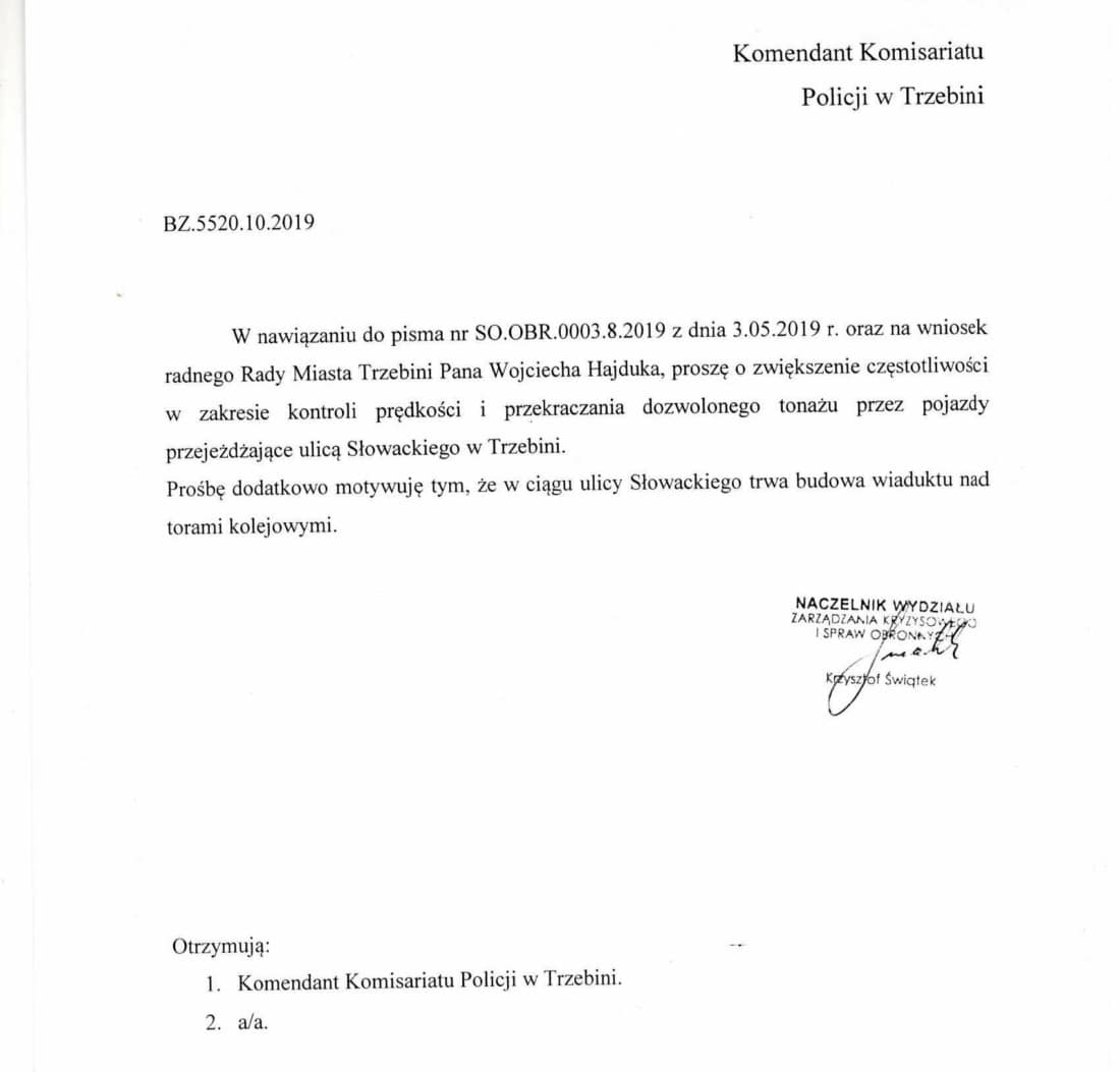 W 2018 r. w Trzebini na ul. Słowackiego odnotowano 2 kolizje, w okresie od stycznia do maja 2019 r. – 2 kolizje, patrole były dysponowane w 2018 r. – 79 razy, w 2019 r. – 21 razy.